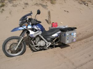 I also couldn’t interpret the signs the only car driver gave to me: the first just shook his head, the second, a freaky old gut lifted his thumb und smiled. I still trusted the guy from the fuel station who said it was an easy ride. But what followed was not compatible with the guys small car, but a pure GS playground: heavy corrugated track, deep waterholes, mud, pure fun, even I hadn’t the best tyres to ride here and far too much luggage on the bike. Anyway.